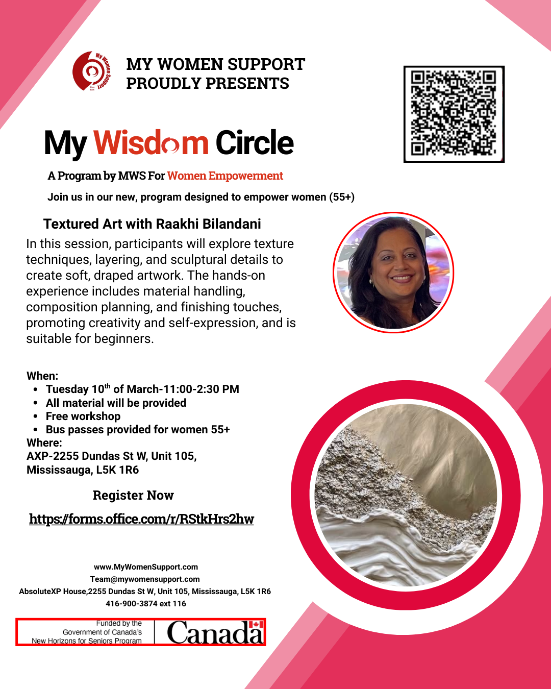 MWC-Textured Art with Raakhi Tuesday, March 10, 2026 11:00 a.m. 2:30 p.m. My Women Support 2255 Dundas St. West, # 105 Mississauga, ON, L5K 1R6 Canada (map) Google Calendar ICS In this session, participants will explore texture techniques, layering, and sculptural details to create soft, draped artwork. The hands-on experience includes material handling, composition planning, and finishing touches, promoting creativity.When:Tuesday 10th of March-11:00-2:30 PMAll material will be providedFree workshopBus passes provided for women 55+Where: AXP-2255 Dundas St W, Unit 105,Mississauga, L5K 1R6 Register Now